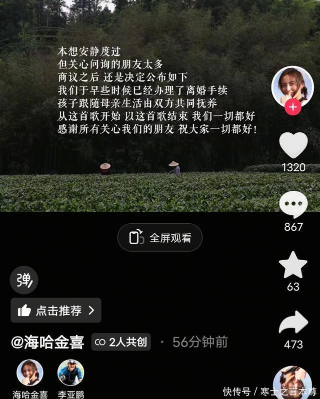 04、“离婚不是失败,是不再自欺欺人” 这场婚姻,没有互撕、没互相指责、没有财产大战。只有一段简洁的视频,一句淡淡的“我们已经离婚了”。 孩子归海哈金喜,两人共同抚养。听起来很理性,也很体面。